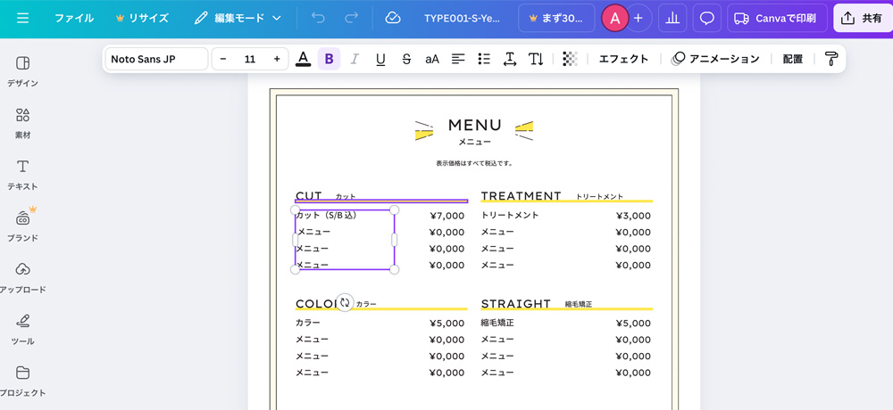 - 文字サイズや行間を調整、または不要な項目を削除してご利用ください。 メニューが足りなくなった場合は住所を削除したり、要素の位置を調整していただくのがおすすめです。各メニュー項目は 行の追加・削除も簡単にできます。 多少の位置調整が必要になることもありますが、サロンの規模やサービス内容に合わせて、ご自由に編集してください。