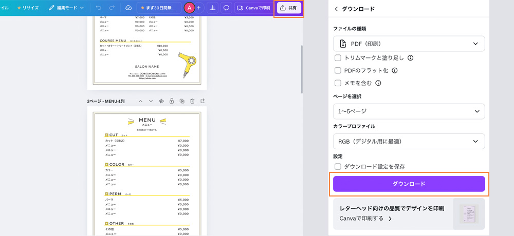 Canvaの編集画面の右上にある「共有」ボタンをクリックし、「ダウンロード」を選択します。 ファイルの種類は「PDF(印刷)」を選んでください。(カラープロファイルについては2025年8月現在、有償版のみCMYKが選択できます。)