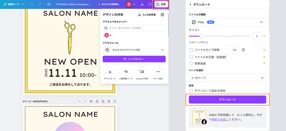 Canvaの編集画面の右上にある「共有」ボタンをクリックし、「ダウンロード」を選択します。 ファイルの種類は「PNG」を選んでください。