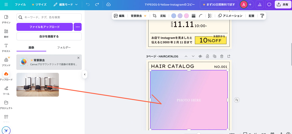「PHOTO HERE」と書かれた部分に、お手持ちの写真を入れ替えることができます。アップロードから必要な画像をアップロードして頂き、差し替えてお使いください。